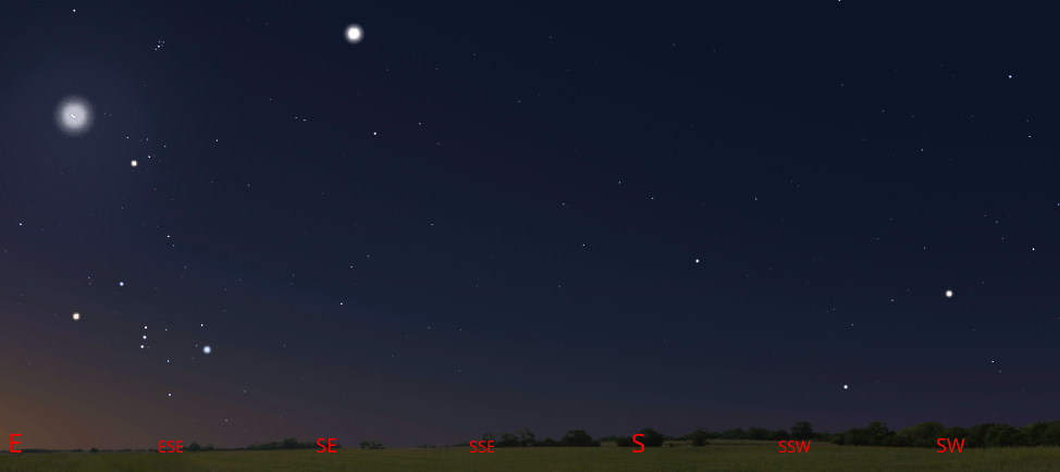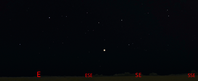 Saturn, low in the east-southeast at 11 pm, or about 2 hours after sunset, along with nearby zodiacal constellations. Click or tap on the image to enlarge it. Created using Stellarium and GIMP.