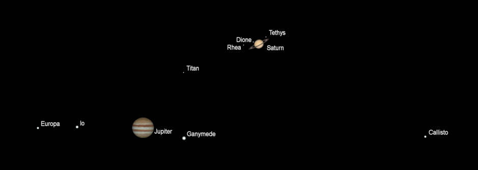 Telescopic Saturn and Jupiter (north up) as they would be seen in a small telescope, with the same magnification, Saturn at 11 pm, the 9th and Jupiter at 5:45 am August 10, 2023. Apparent diameters: Saturn 18.87″, its rings 43.96″; Jupiter 41.02″. Saturn and Jupiter are approaching us, so their apparent diameters are growing. The ” symbol means seconds of arc (1/3600th of a degree). Click or tap on the image to enlarge it. Created using Cartes du Ciel (Sky Charts).