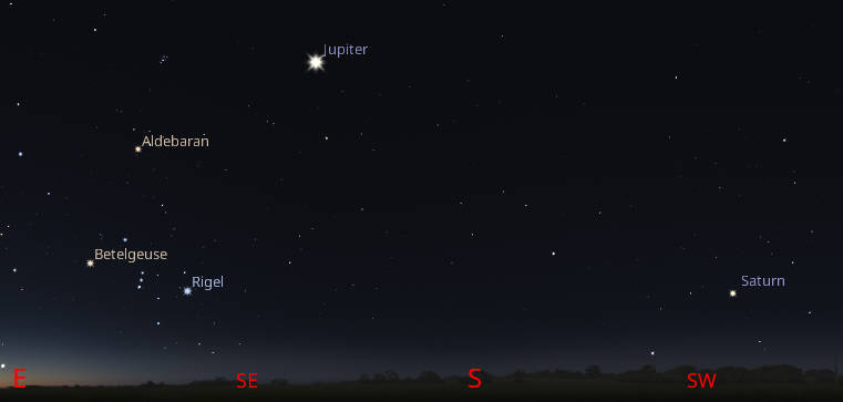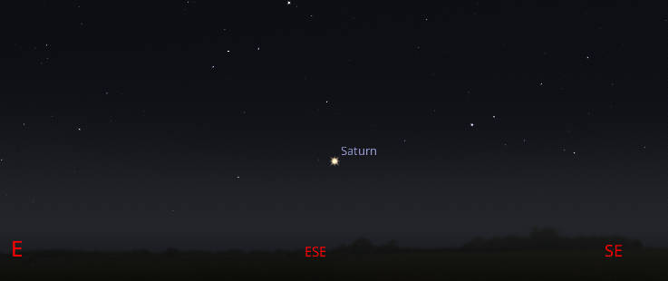 Saturn can be seen low in the east-southeast around 10 pm, or an hour or so after sunset. Created using Stellarium.