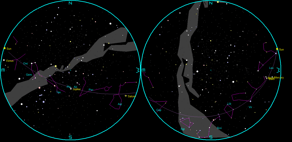 Morning planets and the winter stars are still visible about 45 minutes before sunrise. In the Interlochen/Traverse City Area, that would be about 5:45 am. Large images can be truncated on the right. Click or tap on the image to enlarge and display the complete image. Created using Stellarium.