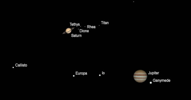 Telescopic Saturn and Jupiter (north up) as they would be seen in a small telescope, with the same magnification, Saturn at 11 pm, tonight, August 16, 2023, and Jupiter at 5:45 am on the 17th. Apparent diameters: Saturn 18.93″, its rings 44.10″; Jupiter 41.94″. Saturn and Jupiter are approaching us, so their apparent diameters are growing. The ” symbol means seconds of arc (1/3600th of a degree). Click or tap on the image to enlarge it. Created using Cartes du Ciel (Sky Charts).