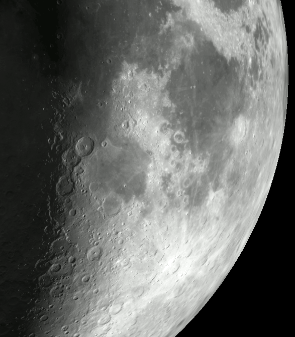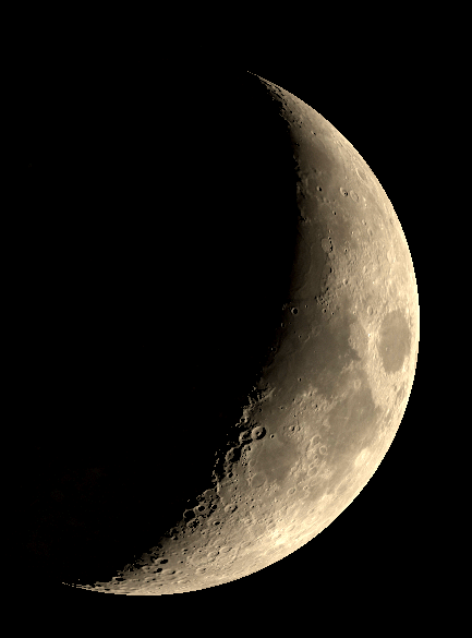 The crescent Moon tonight has what looks like a chain of three large craters near the terminator, visible in a low power telescope. The terminator is the line between day and night. Before the full moon, it’s the sunrise line. On closer inspection, these craters are of different ages. The north crater Theophilus, 63 miles in diameter and one of my favorite craters, looks relatively fresh. It’s not, it’s somewhat older than a billion years. The crater just south of it is Cyrillus, about the same size, which is almost 4 billion years old. Theophilus slightly overlaps Cyrillus. A bit farther south is Catharina, which again is about the same size and age range as Cyrillus, but seems more broken down than the other.