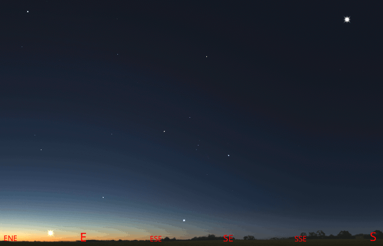 The morning planets at 6:10 am tomorrow morning, August 24, 3023, after Venus rises, with the bright stars of winter slowly disappearing in the advancing morning twilight. Click or tap on the image to enlarge it. Created using Stellarium and GIMP.
