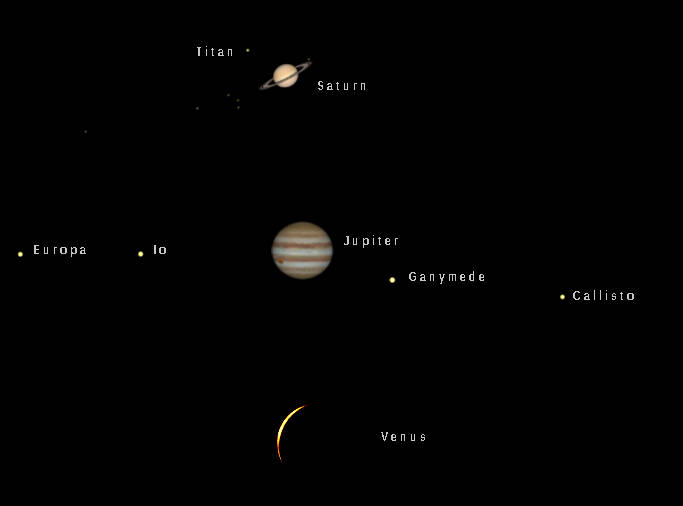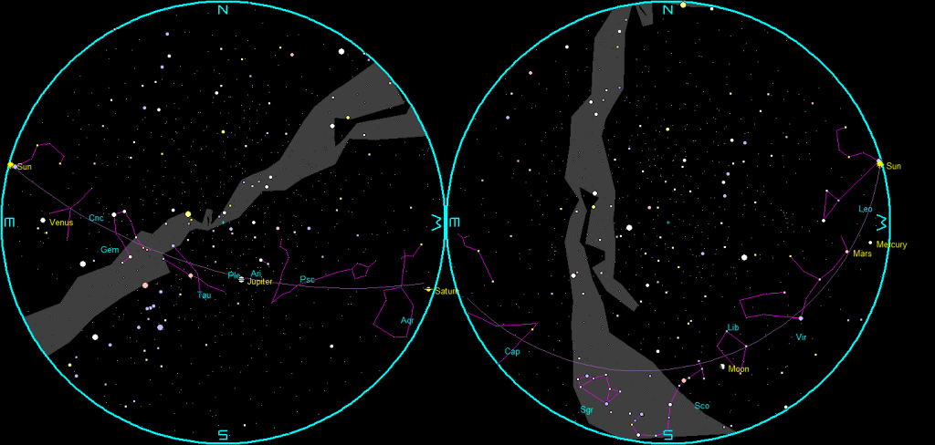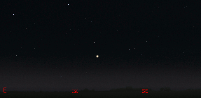 Let’s find out where the naked-eye planets have wandered off to this week. Three of the five planets are now visible. Mars and Mercury are too close to the Sun to be seen. Jupiter, Saturn and Venus are all officially morning planets now, although Saturn does rise in the evening shortly after sunset. It will become an evening planet in four days, when it will rise at sunset. It can be spotted in the southeast in the evening. And it will still be visible throughout the morning hours. Saturn is in retrograde or westward motion now, against the stars of Aquarius. Jupiter will rise at 11:21pm. Venus is making an appearance in the morning sky now. It will rise at 5:53 tomorrow morning in the east.