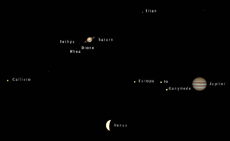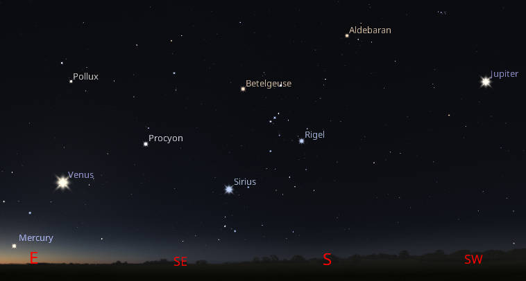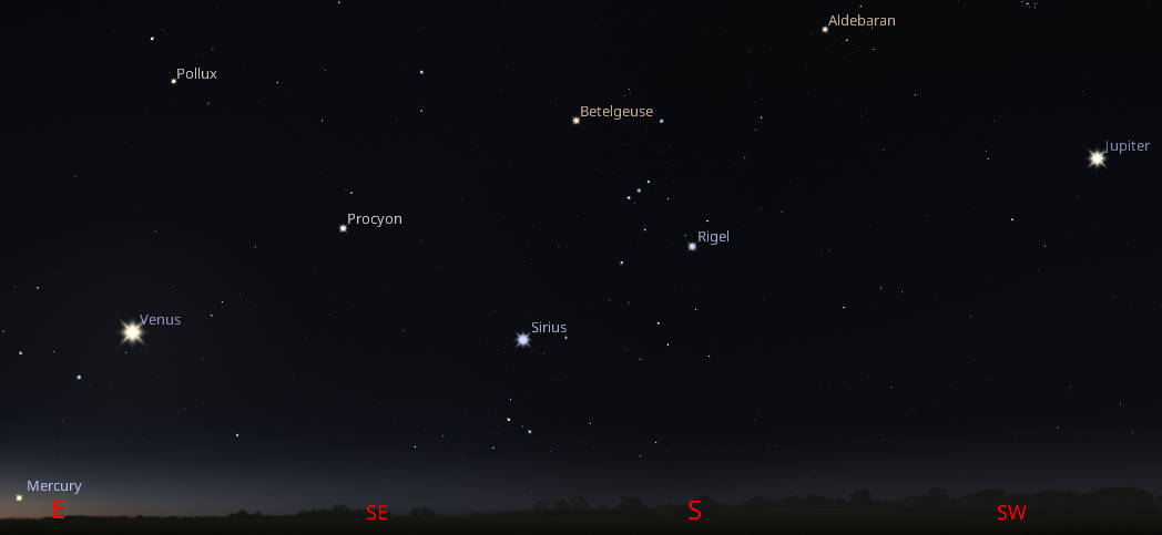 Let’s find out where the naked-eye planets have wandered off to. Four of those five planets are now visible, but Mars is too close to the Sun to be seen. Saturn is the sole evening planet visible. It can be spotted in the southeast in the evening. And it will still be visible throughout the morning hours until it sets at 5:15 am. Saturn is in retrograde or westward motion now, against the stars of Aquarius. Jupiter, Venus and Mercury are the morning planets. Jupiter will rise at 9:35 pm. It is a week into its retrograde motion, which will last the rest of this year. Venus is our brilliant morning star, at its brightest, and will rise in the east-northeast at 4:07 am. Tiny Mercury will have risen by 6 am, and be visible in the east by around 6:30.