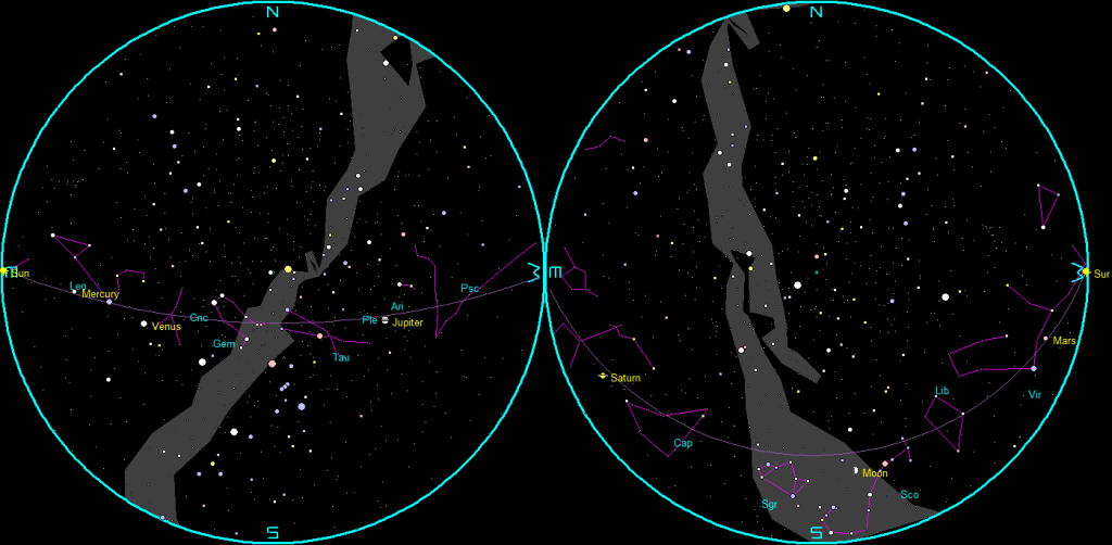 Let’s find out where the naked-eye planets have wandered off to this week. Four of those five planets are now visible, but Mars is too close to the Sun to be seen. Saturn is the sole evening planet visible. It can be spotted in the southeast in the evening. And it will still be visible throughout the morning hours until it sets at 4:44 am. Saturn is in retrograde or westward motion now, against the stars of Aquarius. Jupiter, Venus and Mercury are the morning planets. Jupiter will rise at 9:02 pm. It, like Saturn is moving retrograde, which will last the rest of this year. Venus is our brilliant morning star, at its brightest, and will rise in the east-northeast at 3:59 am. Tiny Mercury will rise at 6:10 am, and be visible in the east by around 6:30.