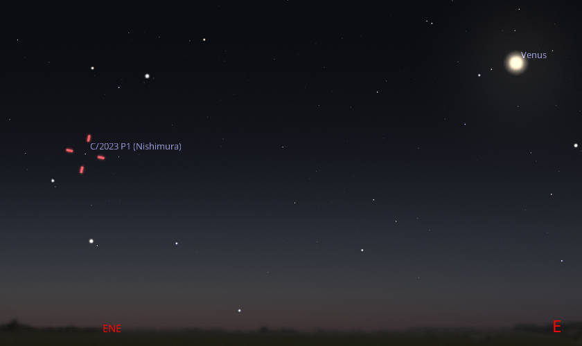 Comet Nishimura is brightening as it approaches the Sun. It will reach 22% of the Earth’s distance from the Sun at perihelion, its closest to the Sun on the 17th, but will be heading south of the Sun, and not be visible to us. Currently, it is in the morning sky, in the east-northeast. At 6 to 6:30 am it will appear in the east-northeast to the left of Venus. It will be probably 4.4 magnitude, which still isn’t easily spotted in a dark sky, much less in the morning twilight glow. If it does have a tail, it will be pointed vertically up from the head of the comet. A pair of binoculars will be needed to spot the comet. Nishimura appears to be a visitor from the Oort cloud of comets, a cloud that stretches about a quarter the way to the next star to the Sun.