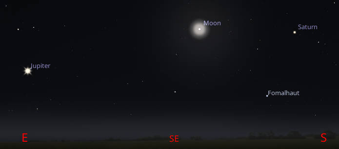 Jupiter and Saturn with the gibbous Moon tonight at 9 pm, October 25th 2023. Created using Stellarium.