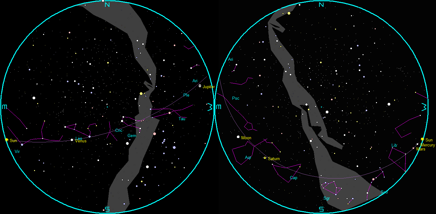 Let’s find out where the naked-eye planets have wandered off to this week. Three of those five planets are now visible, but Mars sets too close to sunset to be seen, and Mercury rises too close to sunrise. Saturn is the sole official evening planet visible. It can be spotted in the southeast to south in the evening. And it will still be visible in the morning hours until it sets at 2:49 am. Saturn is seen against the stars of Aquarius this year and next. Jupiter and Venus are the visible morning planets. Jupiter, still a morning planet for one more week, will rise at 7:04 pm. It’s in Aries this year. Jupiter has to rise before sunset to be an evening planet. Venus, the brilliant morning star, will rise in the east-northeast at 4:09 am.
