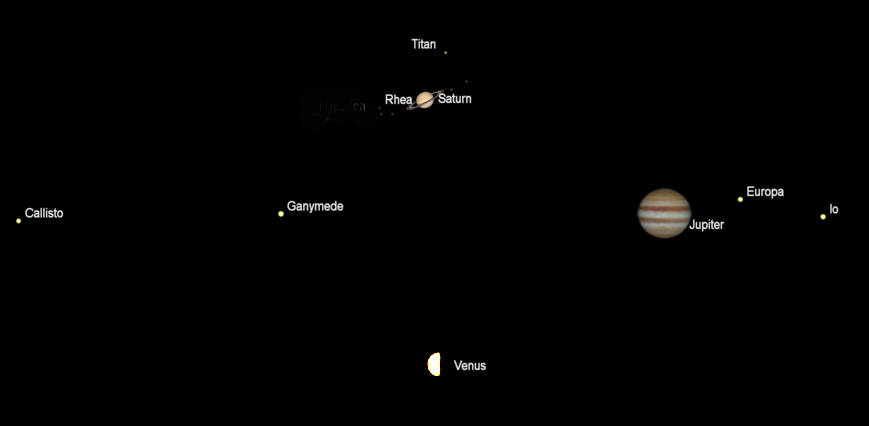Telescopic Saturn, Jupiter and Venus (north up) as they would be seen in a small telescope, with the same magnification. At 9 pm October 25, 2023, for Saturn and Jupiter, and 7 am October 26, for Venus. Apparent diameters: Saturn 17.97″, its rings 41.87″; Jupiter 49.41″; and Venus 23.41″ and is 51.9% illuminated. Note that for Jupiter Europa will disappear in Jupiter’s shadow at 11:33 pm and end its occultation by Jupiter on the other side at 2:16 am; Io will enter Jupiter’s shadow at 6:25 am. The ” symbol means seconds of arc (1/3600th of a degree.) Created using Cartes du Ciel (Sky Charts). Jupiter satellite event timings were taken from https://www.projectpluto.com/jevent.htm