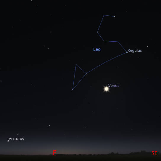 Venus as seen in the sky at 7:00 tomorrow morning, October 26th 2023. It’s seen below constellation of Leo the lion a constellation of spring evenings. Jupiter, not shown, is low in the west at that hour. Created using Stellarium.