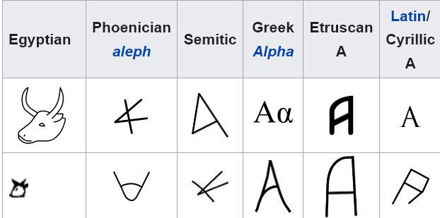 In the eastern part of the sky at 8 pm tonight, above the rising constellation of Orion the hunter, with its three belt stars nearly vertical and its two brightest stars Betelgeuse and Rigel, is an orange star called Aldebaran at one end of a letter V shape of stars which is the face of the constellation Taurus the bull. The V shape of stars is called the Hyades which were the half sisters of the Pleiades above them, according to Greek myth. Back 4,000 or so years ago when alphabets were being invented the vernal equinox or the beginning of spring where the sun was entering was Taurus, rather than Aries, or Pisces as it does today. The Mesopotamians took the shape of the head of Taurus to be the first letter of their alphabet, Aleph, which was an A lying on its side. In early Egyptian hieroglyphics it was the head of a bull. Over time the A got turned around so it was standing on its two legs with its apex on top and a bar across it to become the A we know today.