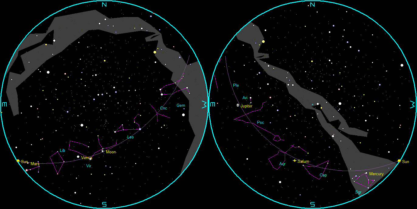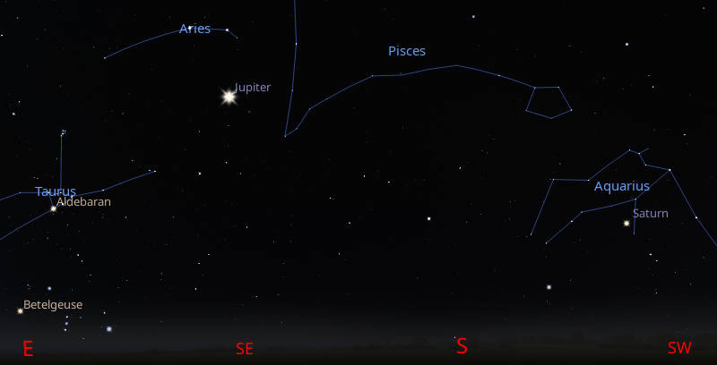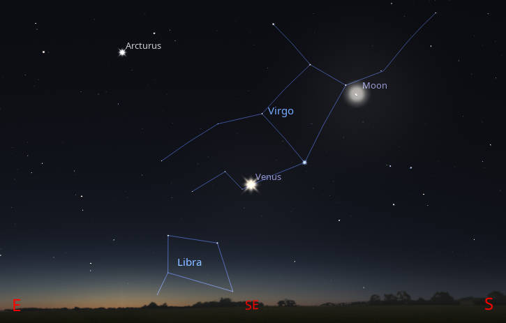 Let’s find out where the naked-eye planets have wandered off to this week. Three of those five planets are now visible, but Mercury sets too close to sunset to be seen. Mars rises too close to sunrise. Saturn and Jupiter are the only evening planets visible. Saturn can be seen moving from the south-southwest to setting in the west-southwest at 11:12 pm. Jupiter will be moving from the southeast to southwest and will be much higher in the sky during the evening hours than Saturn is, and will be up most of the night until 4:56 am. Venus, the brilliant morning star, will rise in the east-southeast at 4:22 am, and be a brilliant beacon in the morning. It will be far below and left of the fat crescent Moon.
