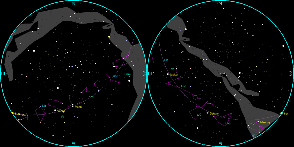 The naked-eye planets and the Moon at sunset and sunrise on a single night, starting with sunset on the right on December 6, 2023. The night ends on the left with sunrise on the 7th. Click or tap on the image to enlarge it. Created using my LookingUp app and GIMP.