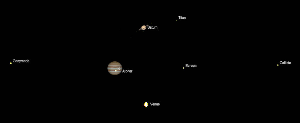 Telescopic Saturn, Jupiter and Venus (north up) as they would be seen in a small telescope, with the same magnification. At 8 pm December 6, 2023, for Saturn and Jupiter, and 7 am on the 7th, for Venus. Apparent diameters: Saturn 16.75″, its rings 39.02″; Jupiter 47.31″; and Venus 16.75″, 70.0% illuminated. Io will be transiting the face of Jupiter at 8 pm, and normally is not visible then, however its shadow might be seen as a dark spot on the planet. The ” symbol means seconds of arc (1/3600th of a degree). Click or tap on the image to enlarge it. Created using Cartes du Ciel (Sky Charts) and GIMP.