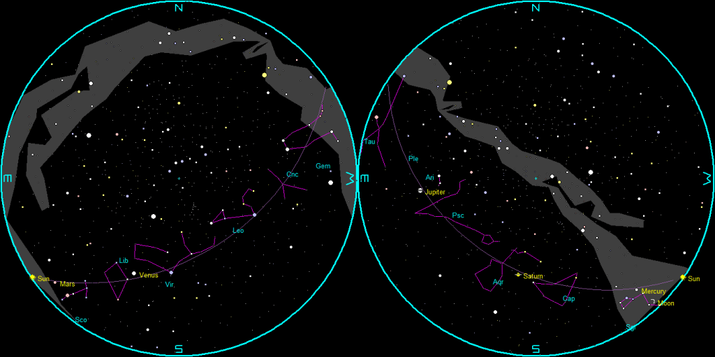 The naked-eye planets and the Moon at sunset and sunrise on a single night, starting with sunset on the right on December 13, 2023. The night ends on the left with sunrise on the 14th. Click or tap on the image to enlarge it. Created using my LookingUp app and GIMP.