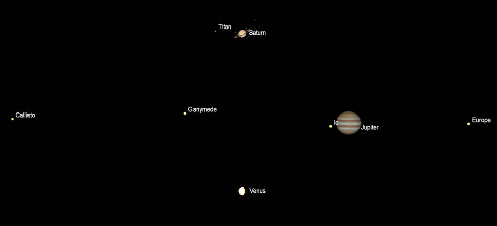 Telescopic Saturn, Jupiter and Venus (north up) as they would be seen in a small telescope, with the same magnification. At 7 pm December 13, 2023, for Saturn and Jupiter, and 7 am on the 7th, for Venus. Apparent diameters: Saturn 16.56″, its rings 38.59″; Jupiter 46.46″; and Venus 15.63″, 72.4% illuminated. Io will be transiting the face of Jupiter from 8:34 pm to 10:44 pm, and normally is not visible then. However, its shadow might be seen as a dark spot on the planet from 9:32 pm to 11:42 pm. The ” symbol means seconds of arc (1/3600th of a degree).Click or tap on the image to enlarge it. Created using Cartes du Ciel (Sky Charts) and GIMP.