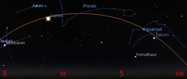 Jupiter and Saturn in the evening sky is it might be seen at 7:00 this evening, December 13, 2023. Also shown are the constellations of the Zodiac and the ecliptic line which is the annual path of the Sun. Click or tap on the image to enlarge it. Created using Stellarium.