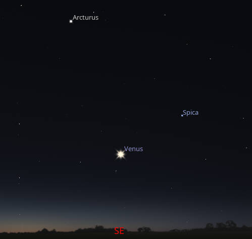 Venus with the bright stars of spring evenings seen that 7 am tomorrow, December 14, 2023. At this time the Big Dipper is very high in the northeast, so spring will eventually come even though it’s not even winter yet. Created using Stellarium.