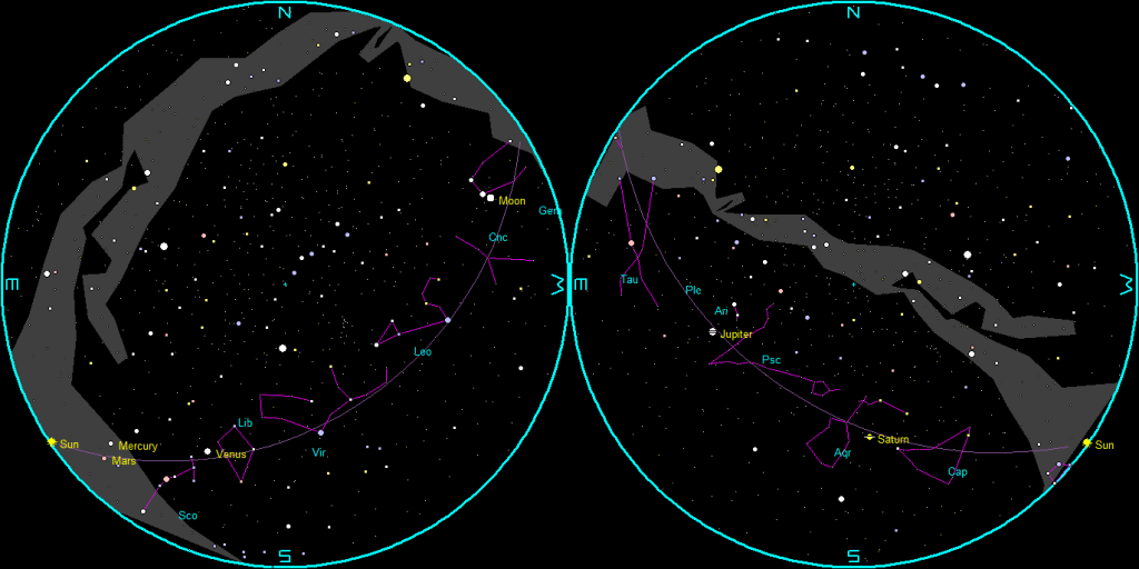 Let’s find out where the naked-eye planets have wandered off to this week. Three of those five planets are now visible. Mercury and Mars rise too close to sunrise to be seen. Saturn and Jupiter are the only evening planets. Saturn can be seen moving from low in the southwest to setting in the west-southwest at 9:54 pm. Jupiter will be moving from the high in the southeast to the west-southwest, by midnight and will set at 3:24 am. The Moon, the night after it being full, will be in Gemini tonight, not that any of its stars will be visible, making the sky bright. Venus, the brilliant morning star, will rise in the east-southeast at 4:56, am, and be a brilliant beacon in the morning, shining in the southeast by before the bright morning twilight claims it around 8 am.