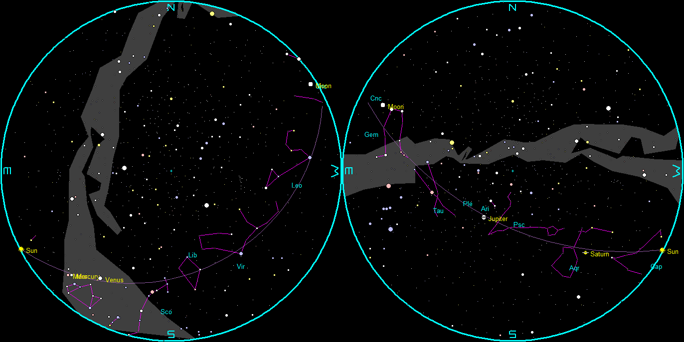 Let’s find out where the naked-eye planets have wandered off to this week. Three of those five planets are now easily visible. Saturn and Jupiter are the evening planets. Saturn is getting harder to spot low in the west-southwest, setting at 8:19 pm. Jupiter will move from high in the south to low in the west by midnight, and will set in the west-northwest at 1:40 am. Venus, the brilliant morning star, will rise in the east-southeast at 6:09 am, and be a brilliant beacon in the morning, shining in the southeast before the bright morning twilight claims it around 8 am. Mercury, which rises by 7:03 am might just be visible below and left of Venus by 7:30 am.