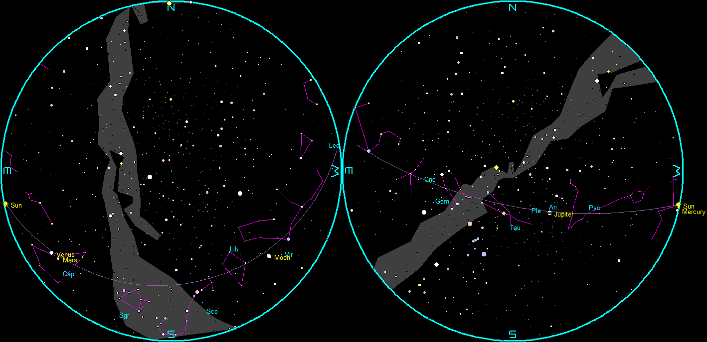 In late winter and early spring dark skies return within a few days after the full Moon. Indeed, this is the first day after the full moon, which was on Saturday morning, that we have dark skies. Well for 40 minutes before the Moon rises. This is because the ecliptic which is the Sun’s path in the sky is as close to vertical as it can get for us. It shows planets near the Sun and the area of the full moon as steeply inclined to the horizon as possible. Twelve years ago this month when my wife and I were on a Hawaiian cruise, I was aboard ship looking at the sky after sunset and was amazed to see Jupiter and Venus* vertically aligned in the west. It was because we were located around the Tropic of Cancer and near the equinox, so the ecliptic was actually vertical after sunset. It was quite a jolt to see that. So this time of year we can see planets close to the sun at sunset and the moon to go away after full rapidly.