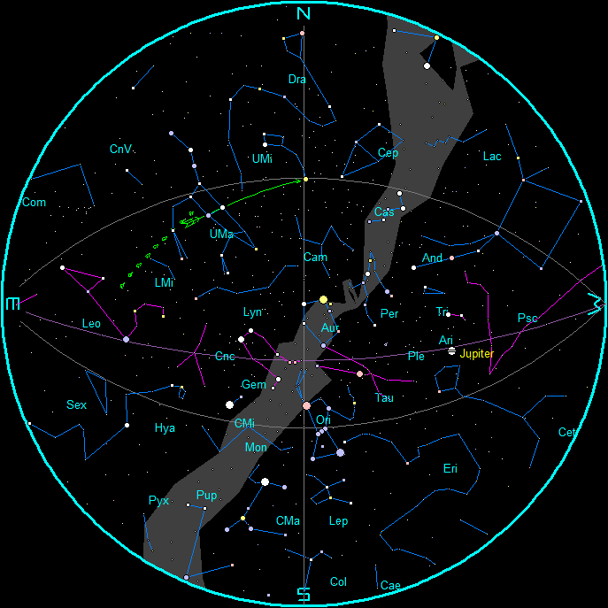 The planets and stars are plotted for the 15th at 9 p.m. EST in the evening and 6 a.m. for the morning chart. These are the chart times. Note that Traverse City is located approximately 45 minutes behind our time meridian. (An hour 45 minutes behind our daylight saving time meridian during EDT). To duplicate the star positions on a planisphere (rotating star finder) you may have to set it to 45 minutes or one hour 45 minutes (Daylight Time) earlier than the current time.