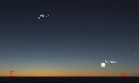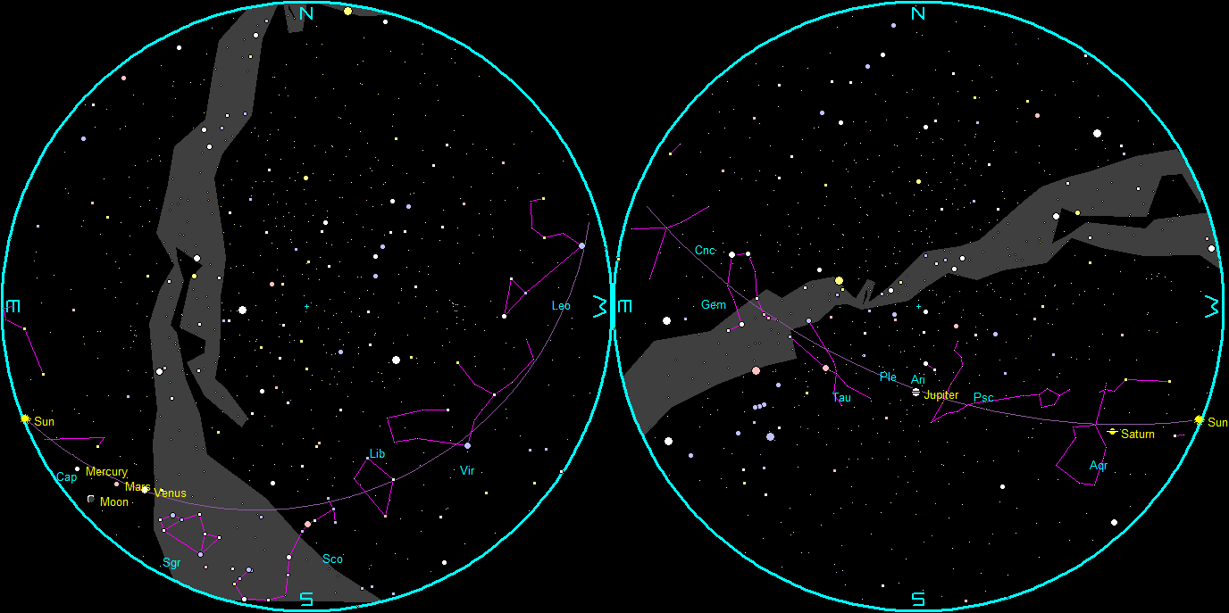 Let’s find out where the naked-eye planets have wandered off to this week. Three of those five planets are now visible. Saturn and Jupiter are the evening planets. Saturn is getting harder to spot very low in the west-southwest, nearly succumbing to evening twilight, setting at 7:32 pm. Jupiter will move from high in the south-southwest to low in the west by midnight, and will set in the west-northwest at 12:53 am. Venus, the morning star, will rise in the east-southeast at 6:25 am, but its brilliance is diminished by the bright twilight and its low altitude in the sky. As we advance through winter into spring Venus is going to be harder to spot before sunrise for two reasons, Venus is getting closer to the Sun, and it is appearing more to the right side of the Sun, than above it.