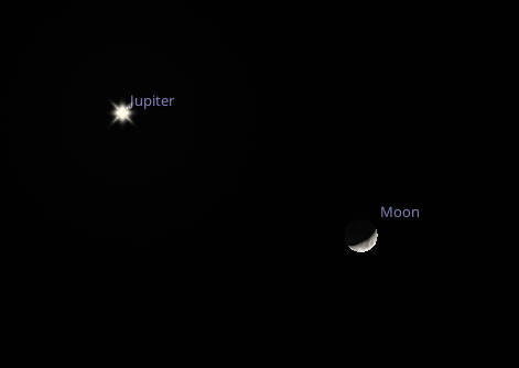 The planet Jupiter and the Moon at 8 pm tonight, February 14th 2024. Created using Stellarium.