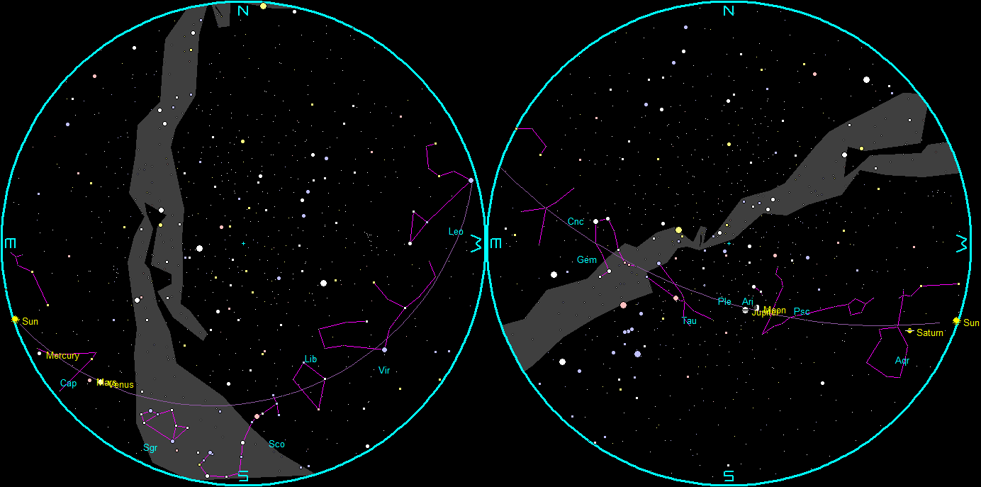 The naked-eye planets and the Moon at sunset and sunrise on a single night, starting with sunset on the right on February 14, 2024. The night ends on the left with sunrise on February 15th. The label for Mars overlays the image of Venus. Click or tap on the image to enlarge it. Created using my LookingUp app and GIMP.