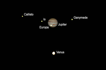 Telescopic Jupiter and Venus (north up) as they would be seen in a small telescope, with the same magnification. At 8 pm EST February 14, 2024, for Jupiter, and 7 am on the 15th, for Venus. Apparent diameters: Jupiter 37.99″; and Venus 11.62″, 88.7% illuminated. Europa will be transiting the face of Jupiter at 8 pm. It starts across at7:20 pm. Satellites are hard to observe when transiting. Europa will end its transit at 9:43 pm. A short time later, at 9:54 its shadow will start to cross the face of Jupiter. The ” symbol means seconds of arc (1/3600th of a degree).Click or tap on the image to enlarge it. Created using Cartes du Ciel (Sky Charts) and GIMP.