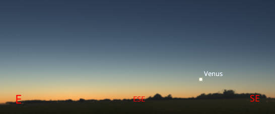 Venus will be seen low in the southeast at 7 am tomorrow, February 15th 2024. Mars is low and left of it, but is too faint and is overpowered by the bright twilight at that hour. Created using Stellarium.