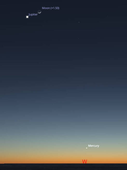 Looking westward at 8:30 pm or about 45 minutes after sunset tonight, March 13, 2024, Mercury is low in the west. Jupiter and the Moon are much higher in the west-southwest. The Moon has been enlarged to better show its phase. Created using Stellarium.