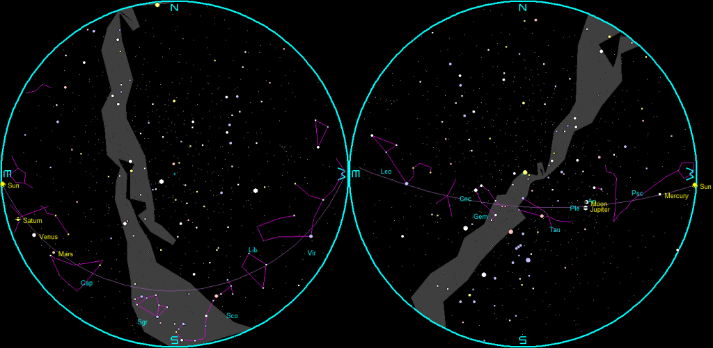 The naked-eye planets and the Moon at sunset and sunrise on a single night, starting with sunset on the right on March 13, 2024. The night ends on the left with sunrise on the 14th. Click or tap on the image to enlarge it. Created using my LookingUp app and GIMP.
