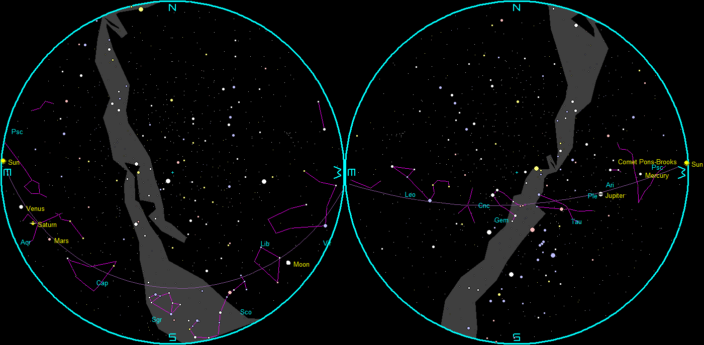 The naked-eye planets, Comet Pons-Brooks, and the Moon at sunset and sunrise on a single night