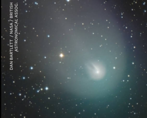 A dim naked eye comet is gracing our evening skies now. It’s called 12P/Pons Brooks. The 12P designation means it was the 12th periodic comet discovered. It was discovered in 1812 by French astronomer Jean-Louis Pons and rediscovered 71 years later on its return by William Brooks. Last July it had an outburst and gained about 100 times increase in brightness. It has held on to most of that. However, right now it’s 5th magnitude which makes it very difficult to spot even in binoculars. Comets always appear to be much dimmer than their magnitude suggests. It was last seen in 1954 and has a 71-year orbit of the Sun that takes it out to Neptune’s orbit. It currently appears below-right of Jupiter.