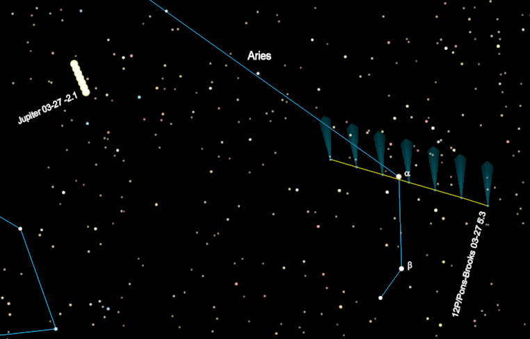 Ephemeris: 03/28/2024 Comet Pons-Brooks can be seen near Jupiter with binoculars
