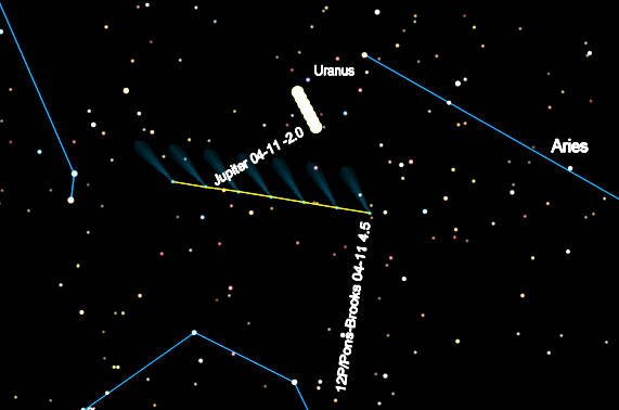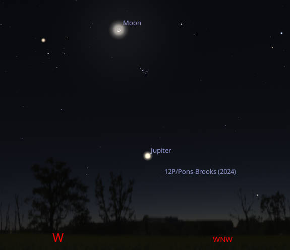 The Moon, Jupiter and Comet Pons-Brooks for 9:30 PM Thursday April 11th 2024. Due to the late post I’m showing this for tomorrow night. Created using Stellarium .