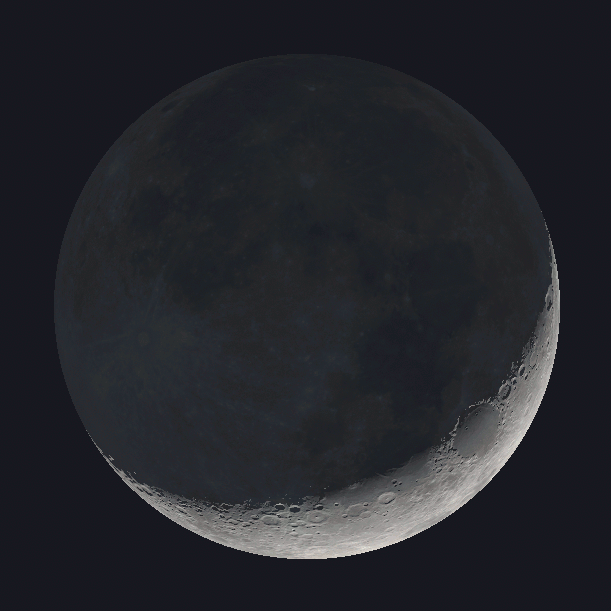The three day old Moon as it might appear Thursday at 9:30 PM April 11th 2024 through binoculars or a small telescope. Selected features are labeled. Created using Stellarium, LibreOffice Draw, and GIMP.