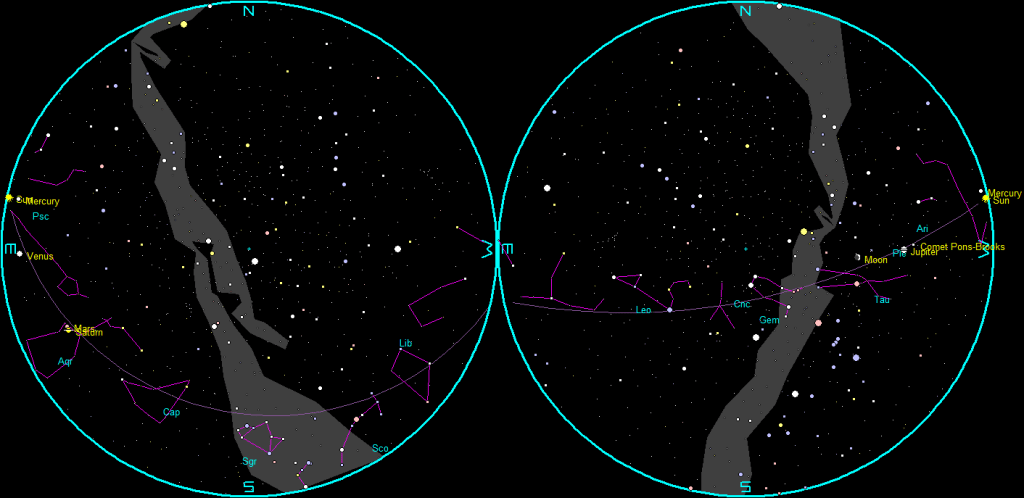 The naked-eye planets, Comet Pons-Brooks, and the Moon at sunset and sunrise on a single night, starting with sunset on the right tonight, April 11th 2024. The night ends on the left with sunrise tomorrow morning on the 12th. Click or tap on the image to enlarge it. Created using my LookingUp app and GIMP.