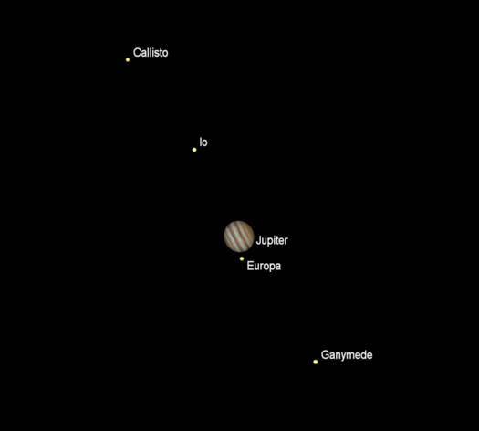 Jupiter as it might appear in a telescope at 9:30 April 11, 2024 in this erect image, showing the position of its Galilean moons. Jupiter’s apparent diameter is 33.54″. Created using Cartes du Ciel (Sky Charts).