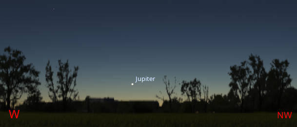 Jupiter appears very low in the West northwest at 9:30 PM which is about 50 minutes after sunset. Created using Stellarium.