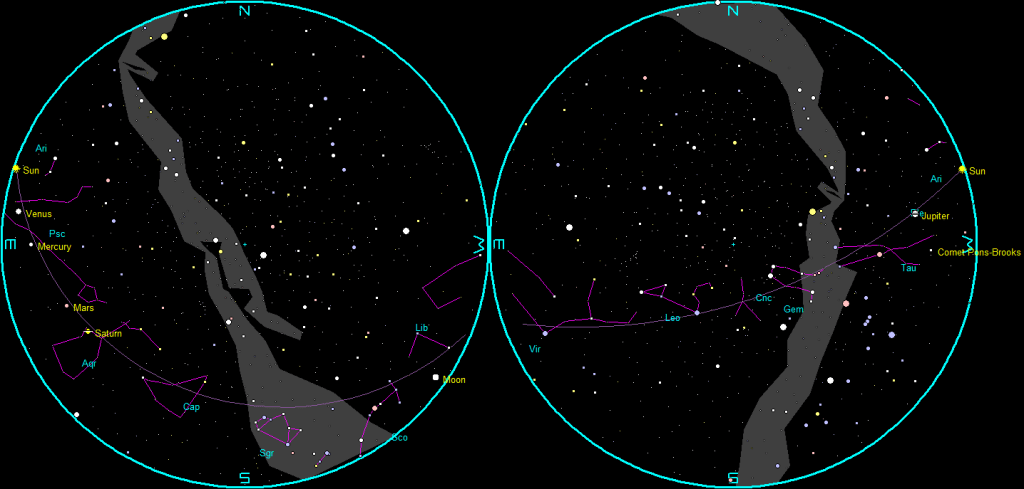 The naked-eye planets, Comet Pons-Brooks, and the Moon at sunset and sunrise on a single night, starting with sunset on the right tonight, April 24th 2024. The night ends on the left with sunrise tomorrow morning on the 25th. Click or tap on the image to enlarge it. Created using my LookingUp app and GIMP.