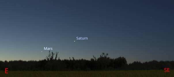 Saturn and Mars is they might appear tomorrow morning at 6:00 AM, April 25th 2024. They might be difficult or impossible to pick out low in the east southeast because they are much dimmer than Jupiter. In fact Saturn is dimmer than it normally is because its rings are nearly edge on and will be edge on to us in 11 months, before opening up again. The rings, when they’re open, contribute a great deal to Saturn’s brightness. Created using Stellarium , LibreOffice Draw, and GIMP.