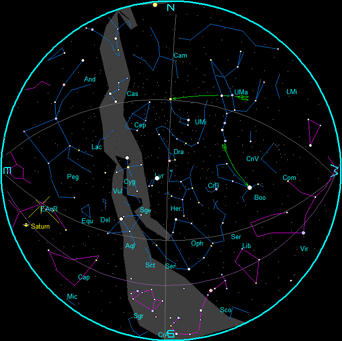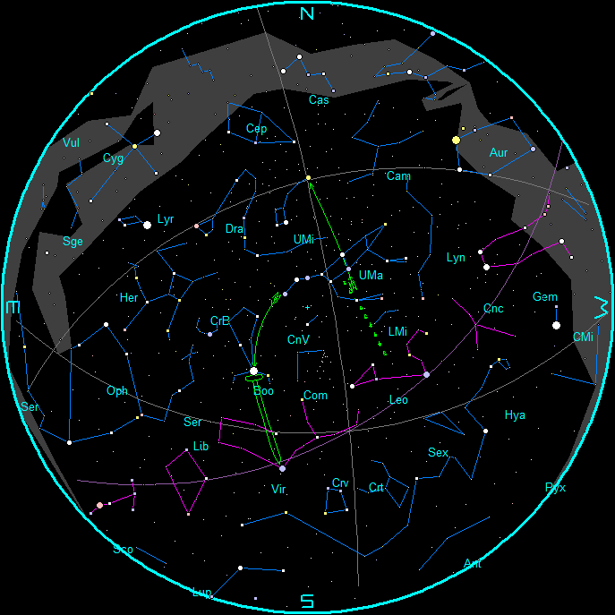 The merry month of May starts tomorrow. Daylight hours in the Interlochen/Traverse City area will increase from 14 hours and 16 minutes tomorrow to 15 hours 20 minutes on the 31st. The altitude, or angle, of the Sun above the southern horizon at local noon will ascend from 60 degrees tomorrow to 67 degrees at month’s end. The altitude of the Sun in the Straits area will be a degree lower than that, but the daylight hours will be a few minutes longer. The evening sky in May is devoid of the Milky Way which nearly rings the horizon, so during this time we are looking out the thin side of the Milky Way towards intergalactic space. There is the Virgo cluster of galaxies, some of which are visible in decent size amateur telescopes.