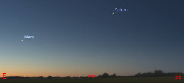 Saturn and Mars as they might be seen low in the southeastern horizon in 5:30 AM, or about 45 minutes before sunrise,tomorrow morning May 16, 2024. Saturn will rise at 3:48 AM, Mars at 4:36 AM. Created using Stellarium.