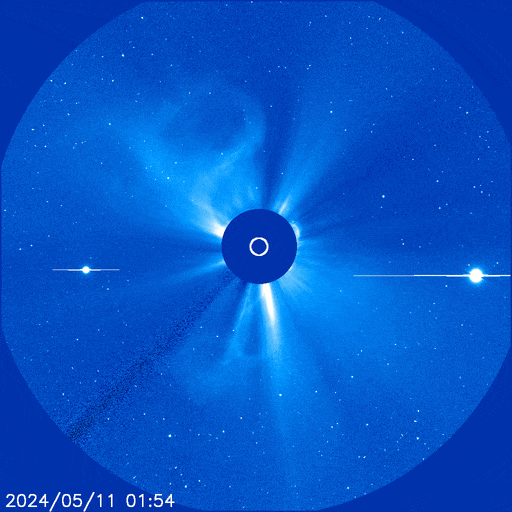 Two of the planets are moving behind the sun. Jupiter is on the left, while Venus is on the right. They will both pass behind the Sun with Jupiter entering the morning sky and Venus entering the evening sky. These images we’re taken by the Solar and Heliospheric Observatory or SOHO, which is a satellite that’s orbiting the Earth-Sun L1 point, a million miles sunward of the Earth. Notice that toward the end of the sequence of images a whole lot of what looks like snow shows up on the image. That is the CME of the 8th reaching SOHO and all the subatomic particles hit the imager in the satellite causing all the snow. An hour later of the of these the CME will tangle with the Earth’s magnetic field. Credit: ESA, NASA.