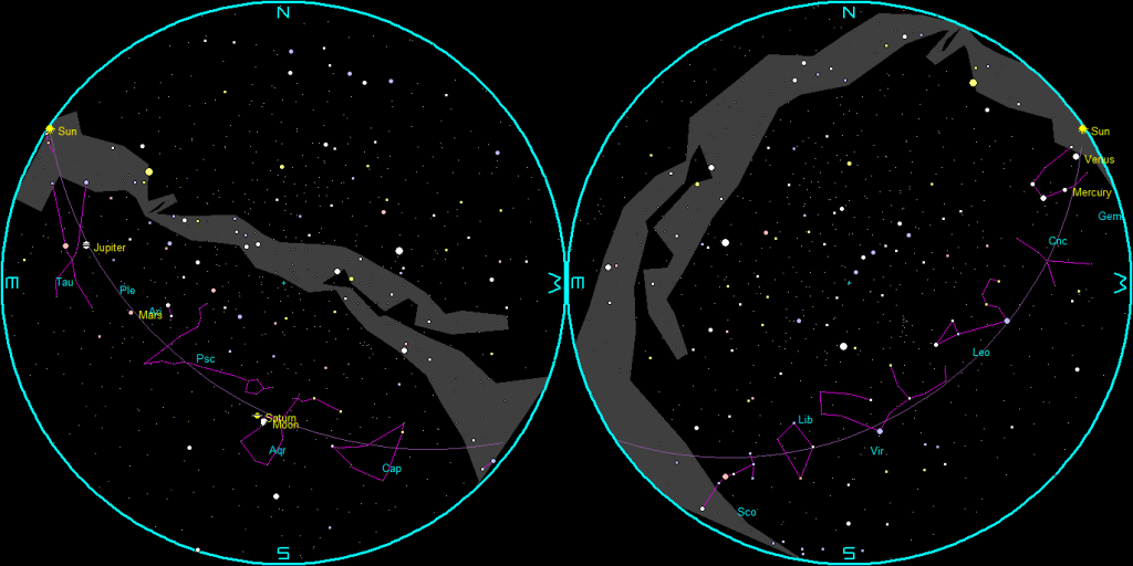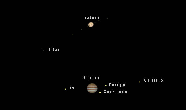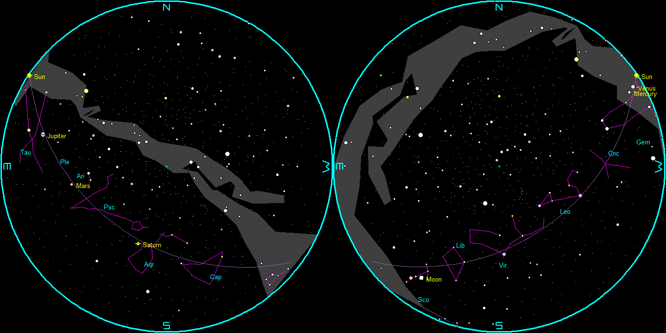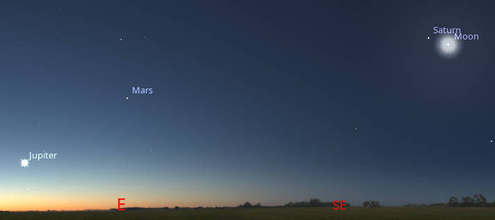 Let’s find out where the naked-eye planets have wandered off to this week. Venus and Mercury are too close to the direction of the Sun to be seen. Both are on the evening side of the Sun, but lost in its glare. Venus will appear in the evening sky next month. By 5:15 tomorrow morning, or about 45 minutes before sunrise, Saturn will be in the southeast just above and left of the Moon, and Mars will be lower in the east, and Jupiter will be very low in the east-northeast. Saturn will be a bit dimmer this year and next due to its rings being nearly edge on to us and not reflecting as much light. Saturn will rise at 1:15 am, Mars at 3:07 am, and Jupiter at 4:19 am.