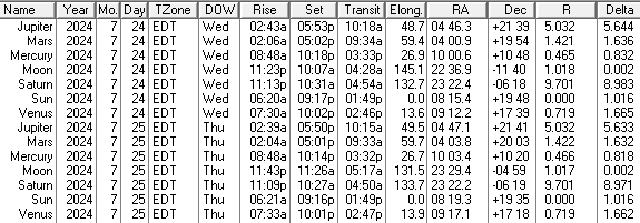 This is an ephemeris of the Sun Moon and naked eye planet positions for today and tomorrow, July 24th and 25th 2024. Some of the columns are self-explanatory, others not. The transit column is the time that the body crosses the meridian and is due south. Elong, for elongation, is the angle between the Sun and that body. RA is right ascension, which is the object’s east-west position on the celestial sphere. Dec is declination which is the north-south position of the object on the celestial sphere. R is the distance of that object from the Sun in astronomical units. An astronomical unit is about 93 million miles or 150 million kilometers. And Delta is the distance of that object from the Earth, also in astronomical units. I omit the ‘m’ in am and pm for compactness. The data was generated using my LookingUp for DOS app and displayed by my Ephemeris Helper app.