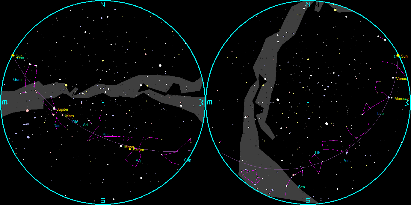 The naked-eye planets and the Moon at sunset and sunrise on a single night, starting with sunset on the right on July 24, 2023. The night ends on the left with sunrise on the 25th. Click or tap on the image to enlarge it. Created using my LookingUp app and GIMP.